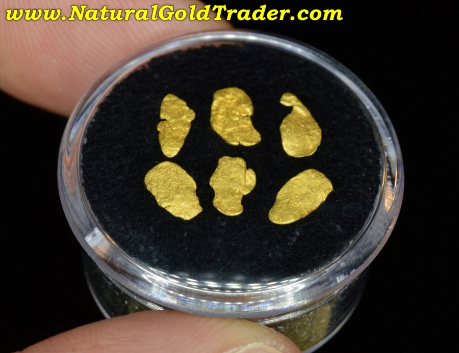 These 6 natural Alaskan placer gold flakes will be shipped in the display jar photographed.