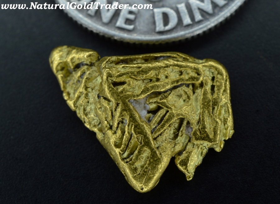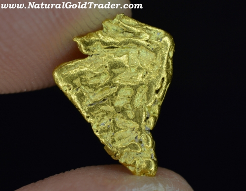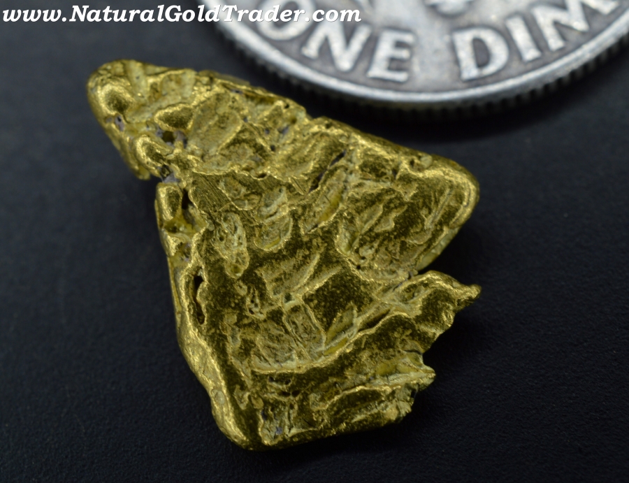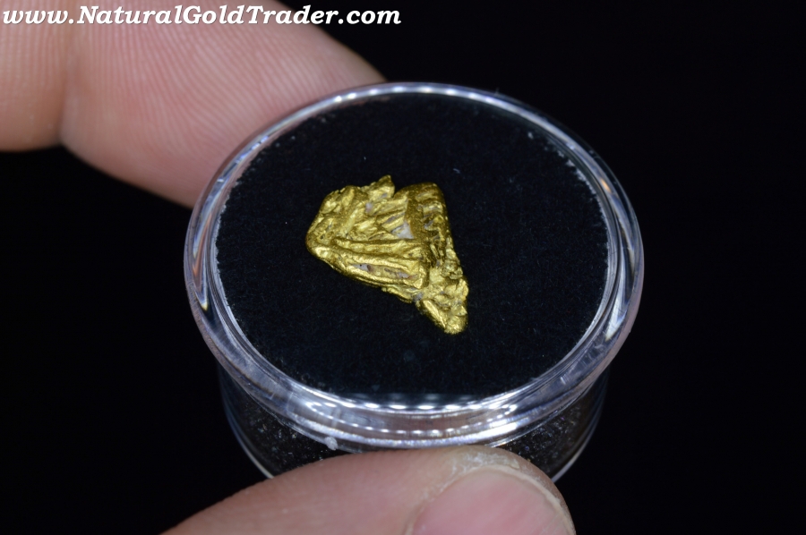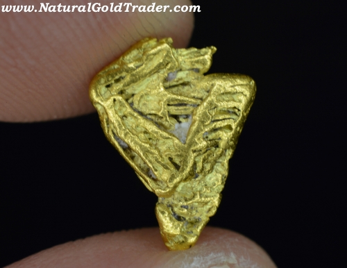 Here is a dandy! This beautiful Northern Nevada chevron gold nugget weighs 1.86 grams, and is a very attractive mineral specimen of gold. Nuggets like this are increasingly rare and valuable. This nugget has traveled a bit in its lifetime but still sports some very nice crystallized chevron structures.