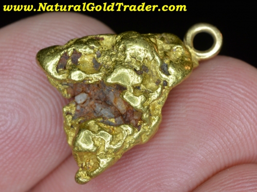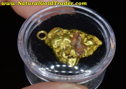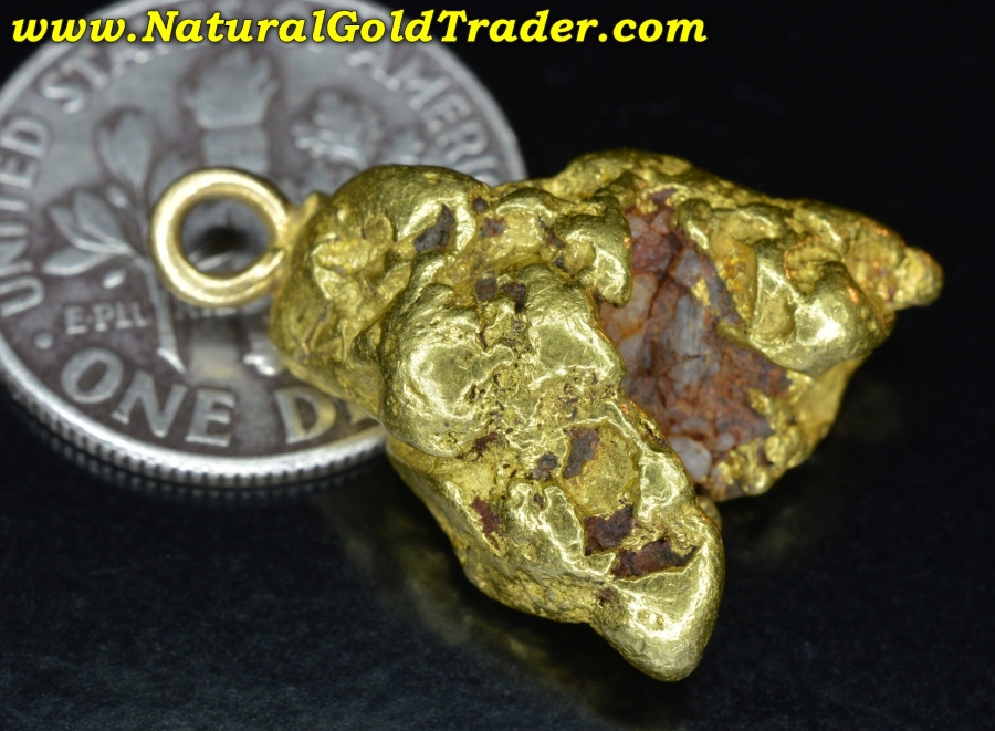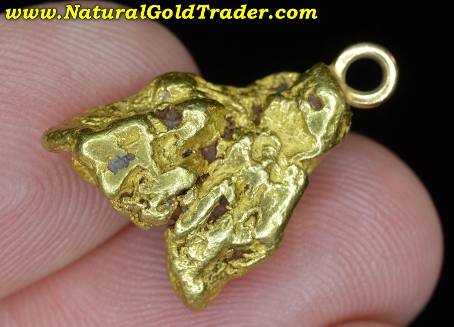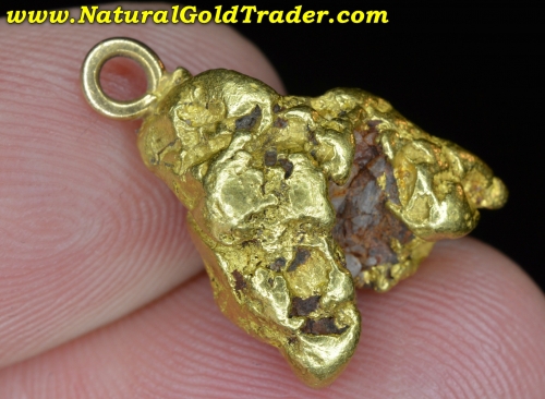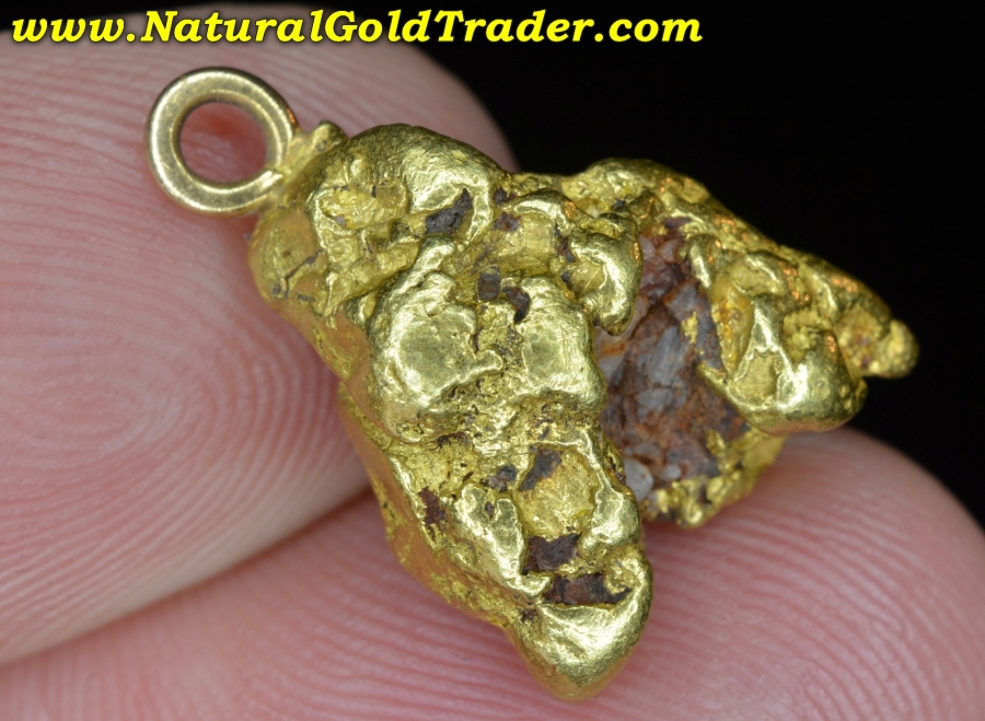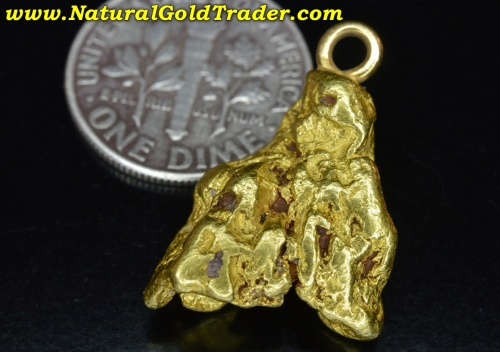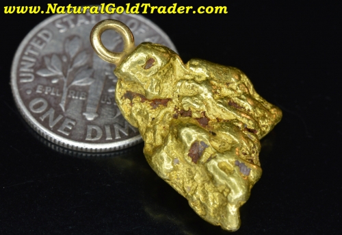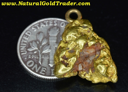 This really neat 100% natural gold nugget was found in the mining districts of the Yukon, and has had a solid gold ring soldered to the top of it. It weighs in at 10.65 grams and has outstanding shape, color & character.