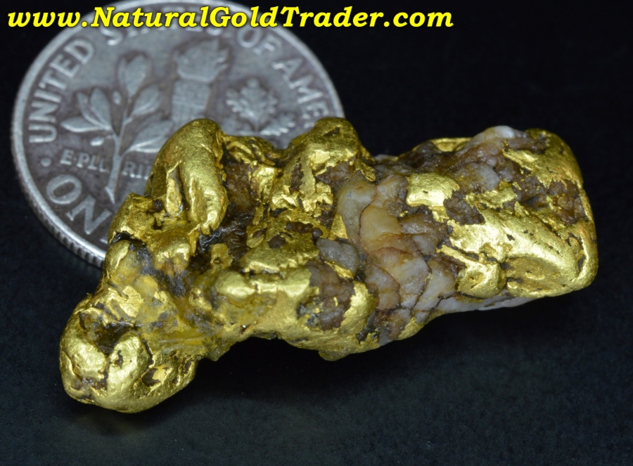 This beautiful natural gold nugget was found on the famous Ganes Creek in Alaska. It weighs 13.49 grams with only a couple grams of that weight being quartz. It was found in the old-timer's tailing piles by a prospector armed with his metal detector several years ago. It has fantastic color & character and will be a wonderful addition to someone's natural gold nugget collection!
