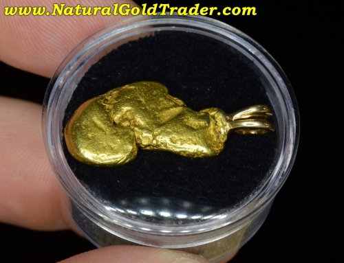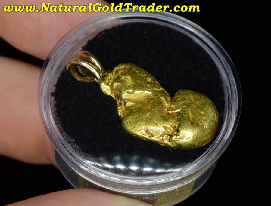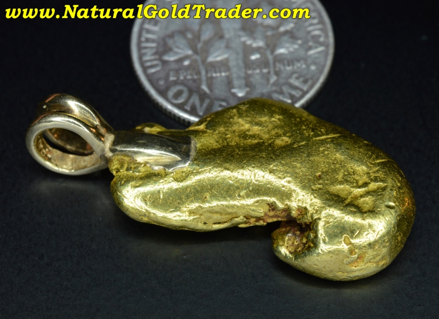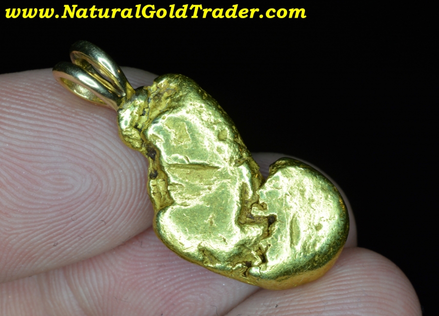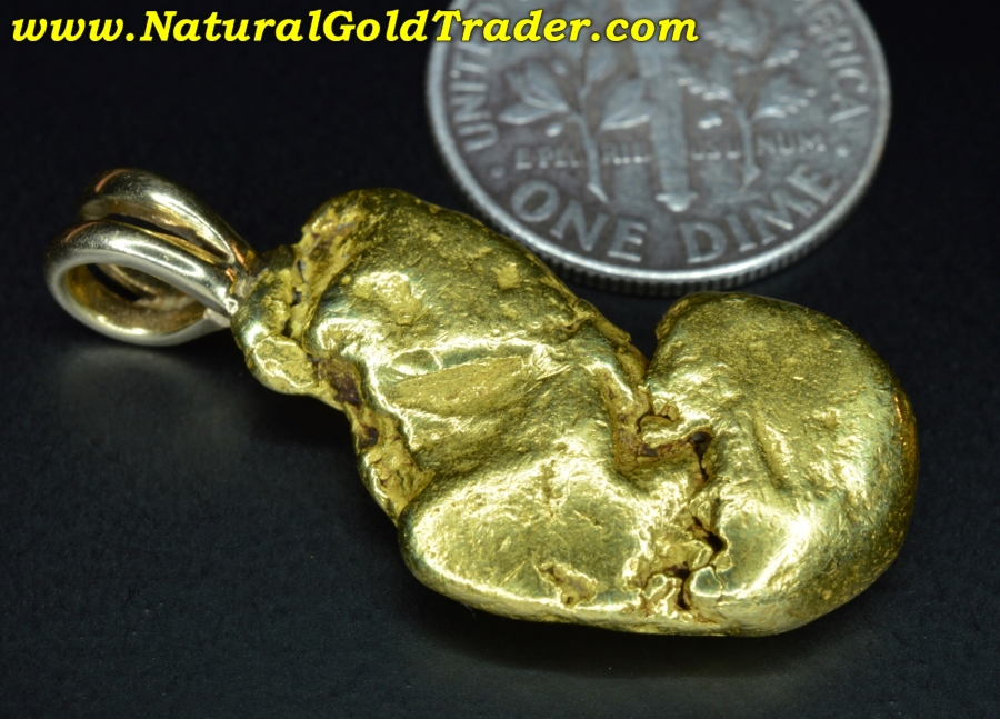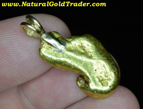 This dense & solid gold nugget was found in a placer gold mining operation in our most Northern State, and has been turned into a gorgeous gold nugget pendant. It weighs 13.95 grams and has excellent color & character. It's ready for a chain and will look awesome dangling from someone's neck!