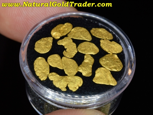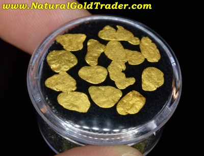 These fourteen jewelry quality large Alaskan natural gold flakes will be shipped in the display jar photographed.