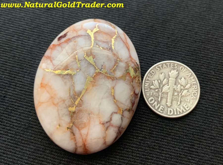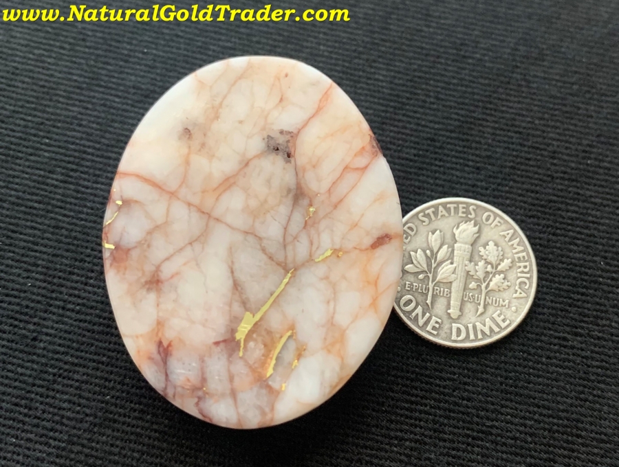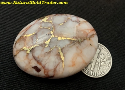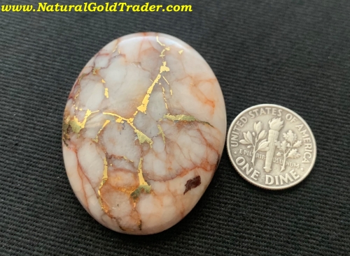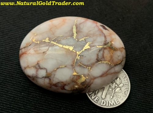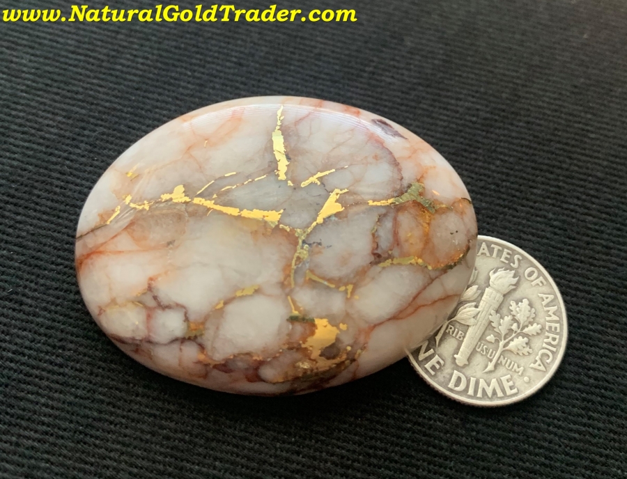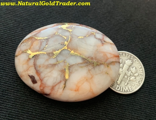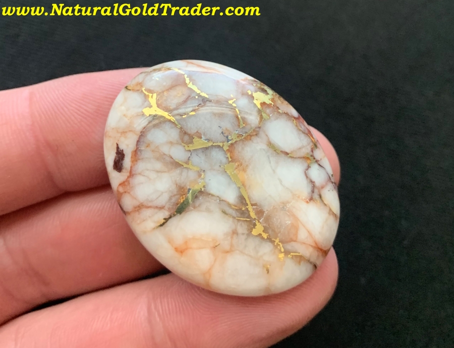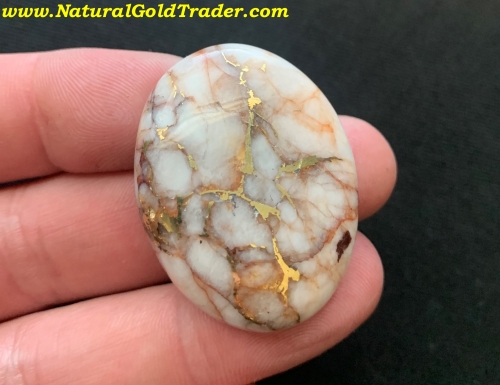 This outstanding stone was recently cut from a gold & quartz specimen that was found with a metal detector in El Dorado County. It weighs 20.76 grams or (103.8 carats) and is ready to be placed into a piece of jewelry. The dimensions of this cabochon are 31.7 x 41.2 mm.