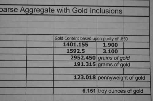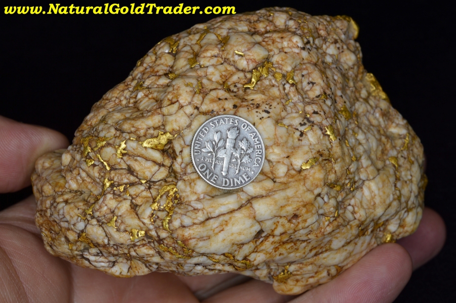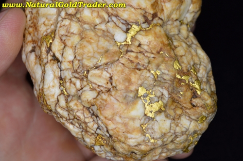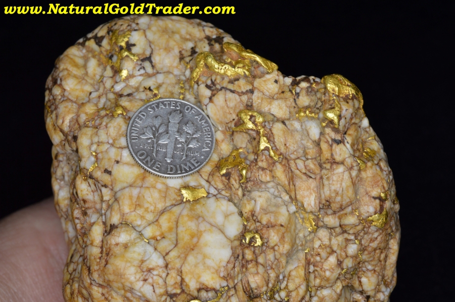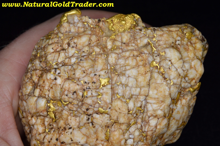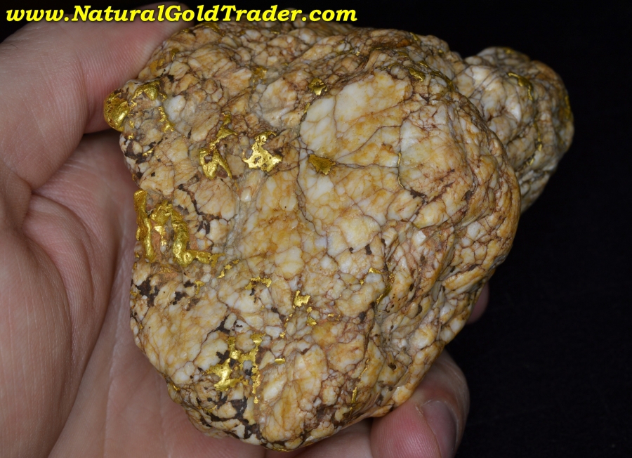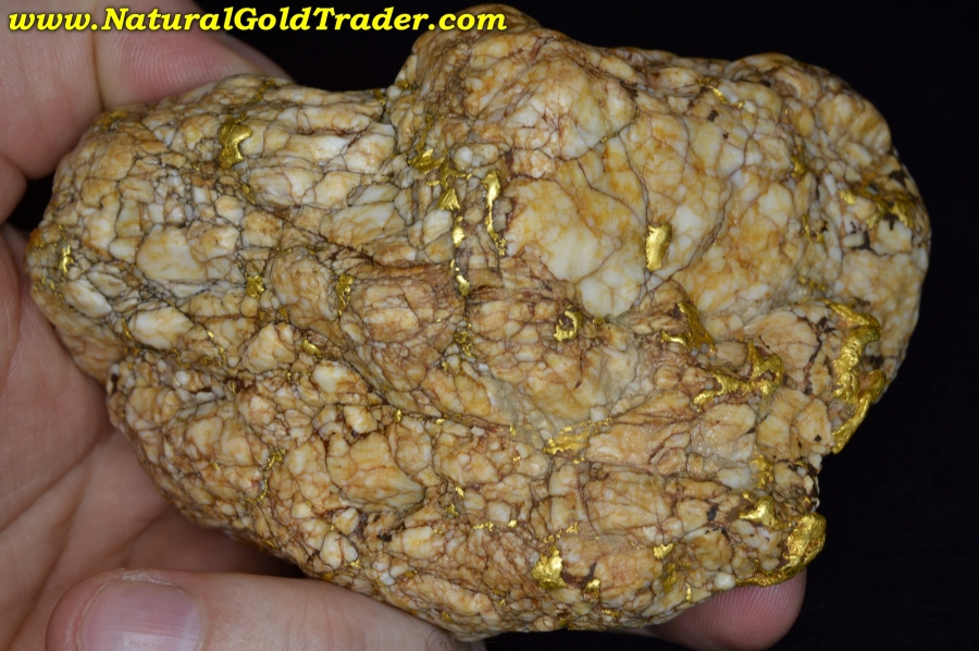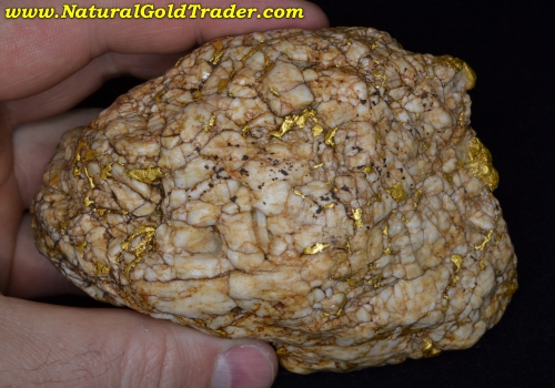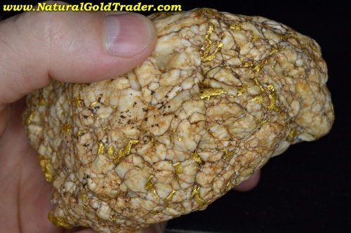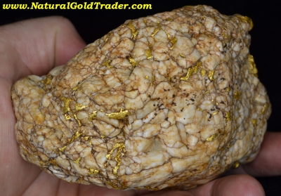 This unreal specimen weighs 23.71 troy ounces. We have had a professional specific gravity test preformed on this huge specimen. The test indicates that there is 191.31 grams or (6.15 ozt.) of very yellow and pure native California Gold! That's just over one half troy pound!! We also used a continuity tester on this specimen and almost all of the gold is connected to itself throughout the quartz.