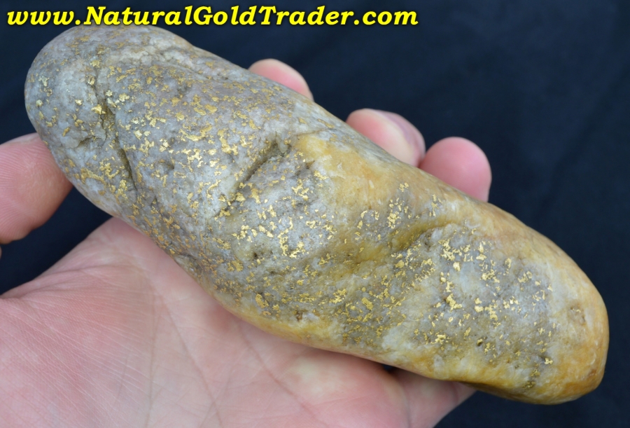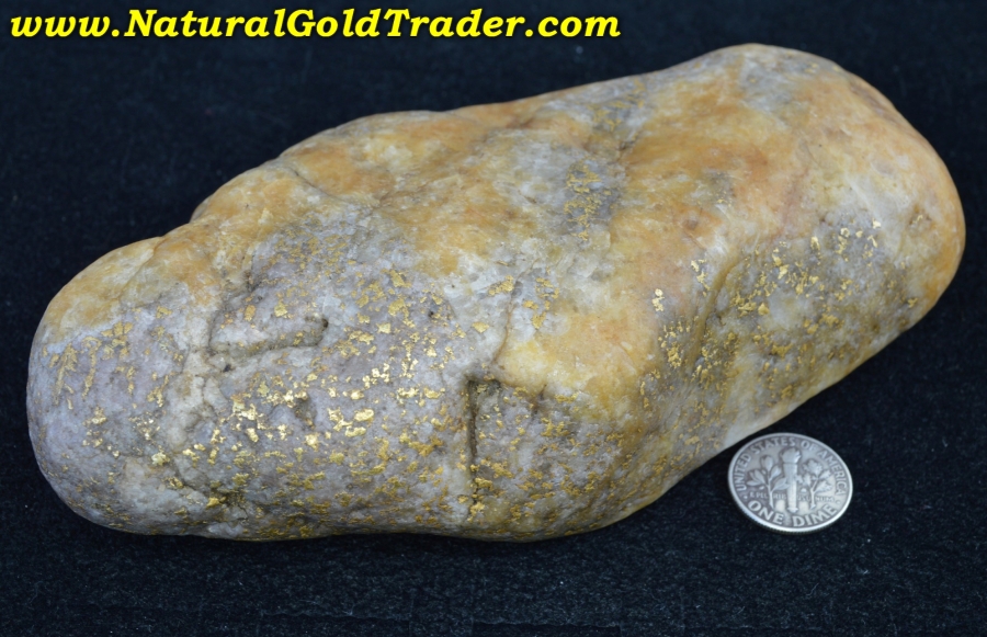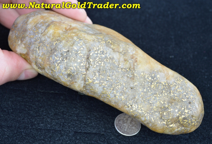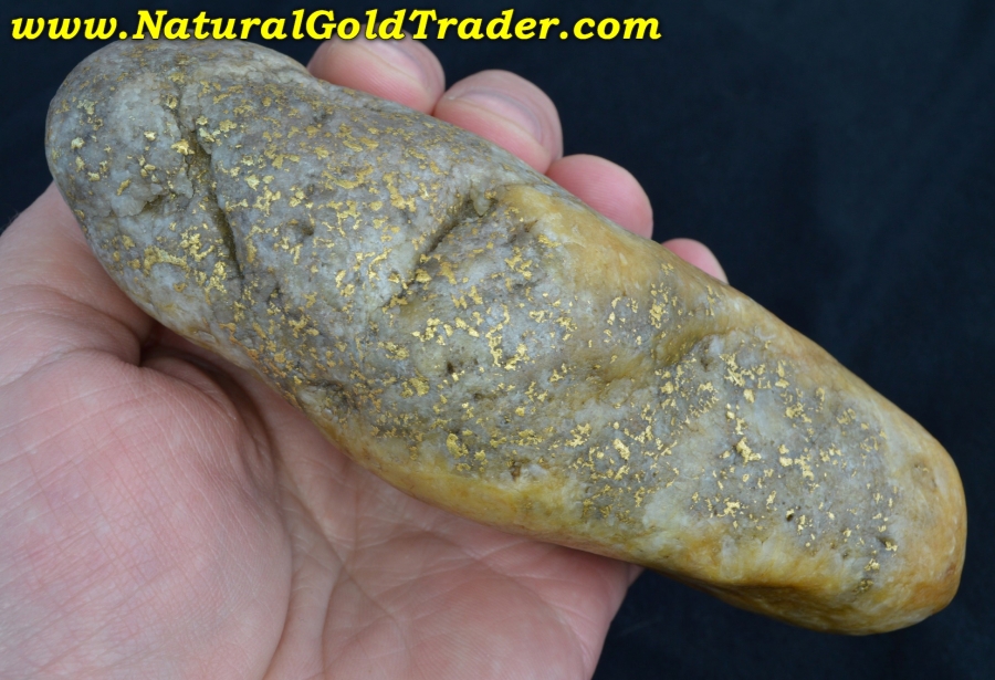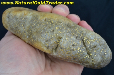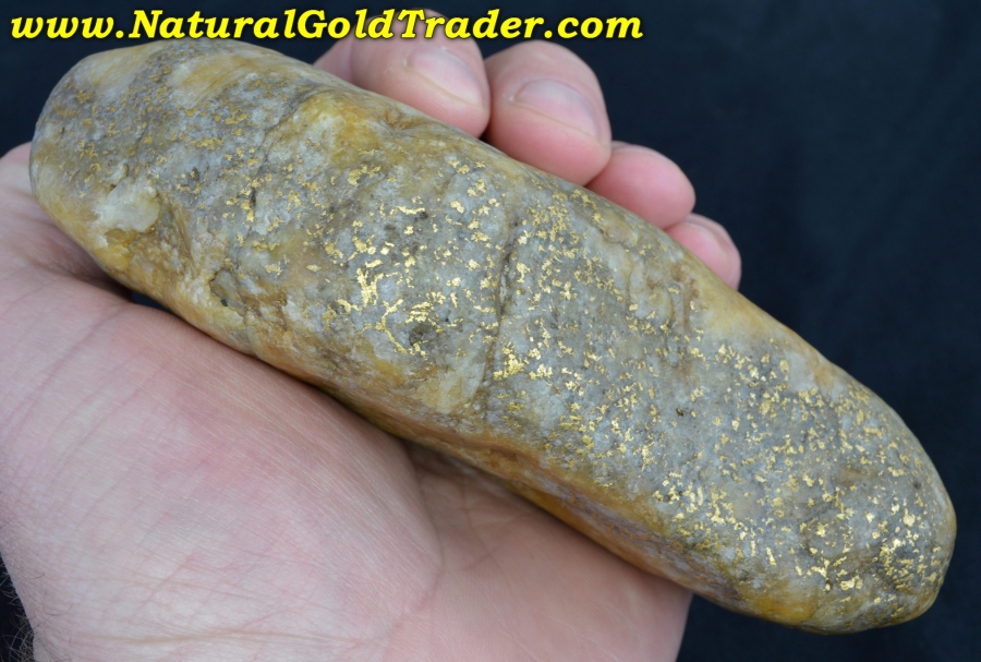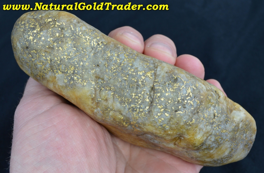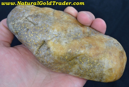 This fantastic one of a kind gold & quartz "Idaho Potato Specimen" was found with the help of a metal detector in Idaho. It weighs in at a whopping 814.8 grams (26.19 ozt.) and is loaded with yellow gold exposed pretty much on all sides. The specific gravity test says there is 231.90 grams (7.45 ozt.) of gold contained throughout this incredible quartz boulder. Natural gold specimens like this one offer a fun & exciting way to protect & preserve wealth. This jaw-dropping gold & quartz specimen will be a wonderful addition to someone's natural gold & quartz specimen collection!