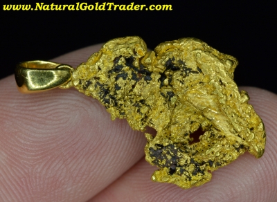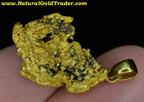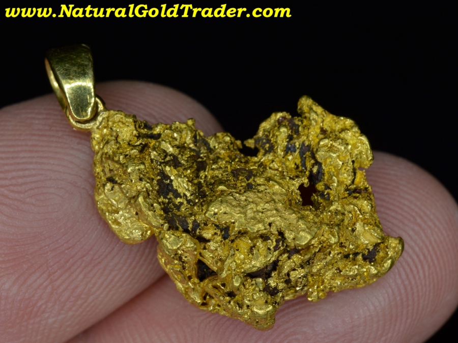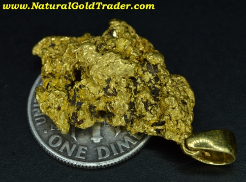 This sweet gold nugget pendant weighs 9.20 grams and has never been worn. It has a very pretty two part solid gold bail and is going to look great dangling around someone's neck! The miner who found this piece believes that this gold was brought into the area by a glacial deposit.
